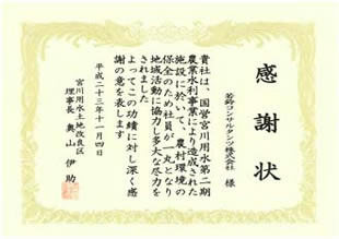 宮川用水の関連施設における環境美化活動に対しまして、宮川用水土地改良区理事長より感謝状を