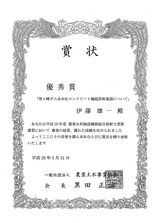 平成25年度 農業水利施設機能総合診断士更新講習におきまして、伊藤雄一が優秀賞を拝受致しました。
