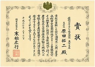 平成26年度 関東農政局所管農業農村整備事業等優良工事等の請負者等の表彰におきまして地域貢献活動に対して表彰状を拝受致しました。